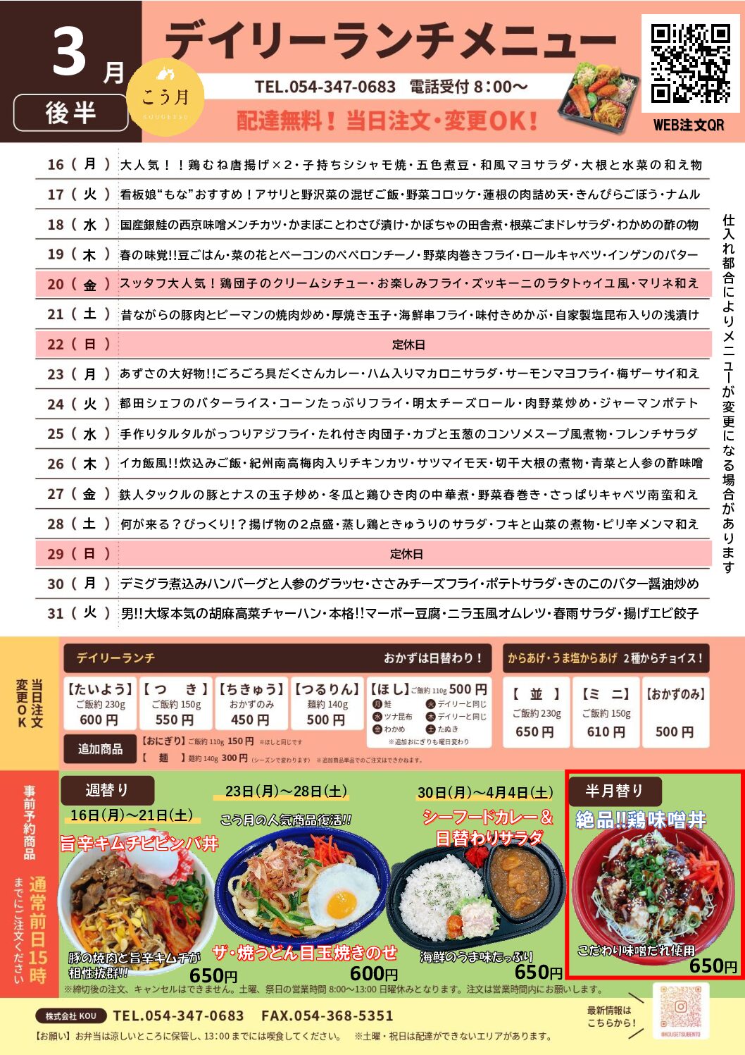 こう月では、週に3回以上ご注文をいただける配達区域内の企業様へランチの配達をしております。
